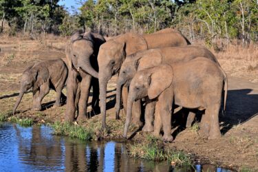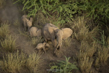 Elephants live in family groups called herds. These herds are made up of grandmothers, mothers, aunts, sisters, and their calves (baby elephants). The leader of the herd is called the matriarch; she’s the oldest and wisest elephant. She teaches the herd where to find food, water, and shelter during dry times. Elephants don’t like being in the sun too much, so they protect their skin by rolling in mud and throwing dust over themselves with their trunks. They only sleep a few hours a day because they are so busy traveling and eating.