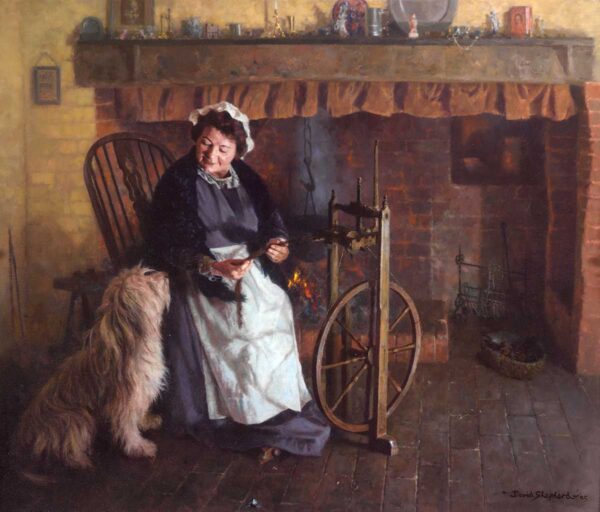 As quoted by David, “Barbara posed for this picture with Muffin our bearded collie. While Barbara was trying to get on with the spinning, Muffin was trying to persuade her that going for a walk would be far more fun. The fireplace was in our home at the time – an Elizabethan farmhouse dating from 1560. The original hooks in the inglenook fireplace were in the brick wall to hold the curtain back.”