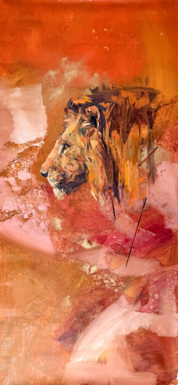 An original painting pulsing with raw intensity, Heat and Power channels the drama and tension at the heart of lion society. Emily Lamb’s layered, expressive style brings the canvas to life with the heat of the sun, the charge of rivalry, and the sheer physicality of big cats in motion. Guided by her lifelong fascination with Africa, a place she describes as an “ancient realm” that continually shapes her work, Emily translates emotion into energy, and energy into light. The result is a vivid, dynamic tribute to the power structures that govern the wild, and to the timeless connection between predator, landscape, and spirit.