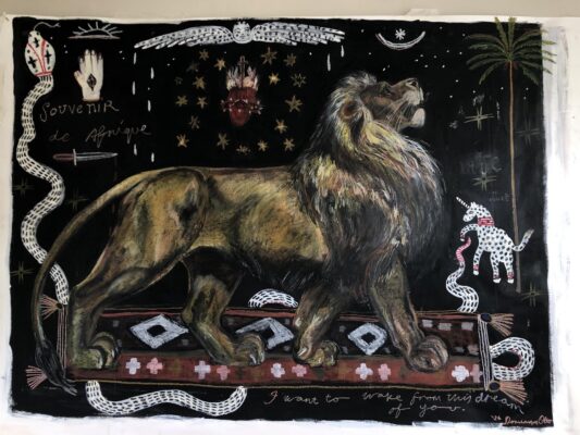 Artist biography Dominique’s work draws on deep influences from symbolism, nature, and the unspoken language of animals. Her painting practice is shaped by a background in music, drawing from the simplicity of blues music, the raw honesty of punk music, and the poetry of folk music. The power of traditional tattoos, a deep connection to spirituality and duality, have helped her form an instinctual visual language.