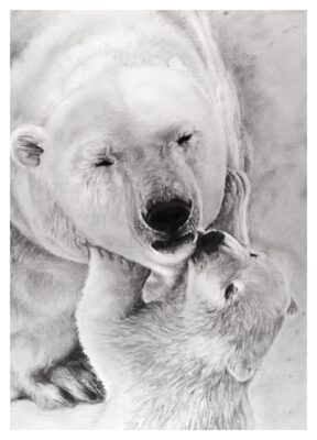 This artwork, titled “Mother & Cub” by Tom Middleton, beautifully captures the tender bond between a polar bear and her cub. Rendered in delicate monochrome, the piece emphasises texture and emotion, showcasing the protective warmth of the mother and the cub’s playful affection.