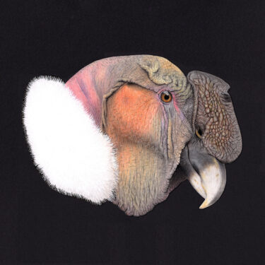 Anastasia Mattern has drawn in highly realistic detail the featherless head and ruffed neck of the Andean condor. She has then carefully cut out her drawing and placed it against a black paper background offering the viewer an intimate portrait of the world’s largest flying bird. Anastasia was inspired to create her work to highlight the declining numbers of this species caused by habitat loss.