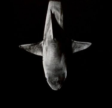 Mike Pickett’s powerful, birds-eye-view chalk drawing on black paper is of an incredibly important predator of the great oceans. It is Mike’s belief that without sharks the whole oceanic ecosystem is altered and as such poses a great threat to oceanic wildlife across the whole food chain.